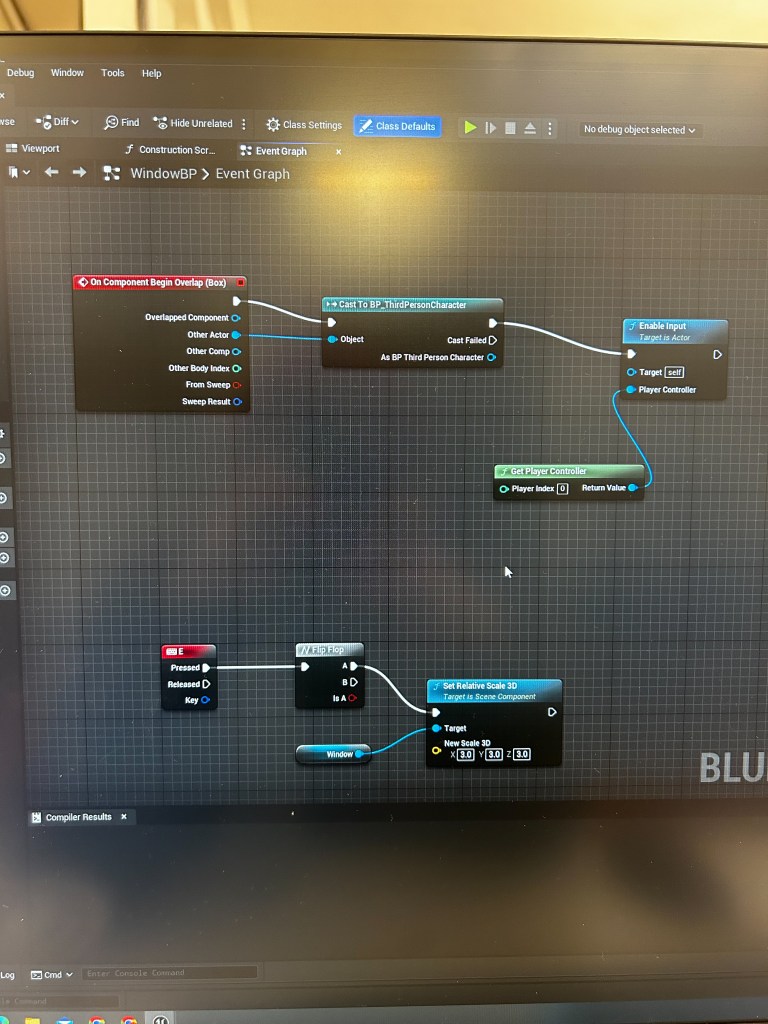 I was attempting to create a blueprint for the third person actor interacting with the window- as the third person approached closer to the window, it would open.