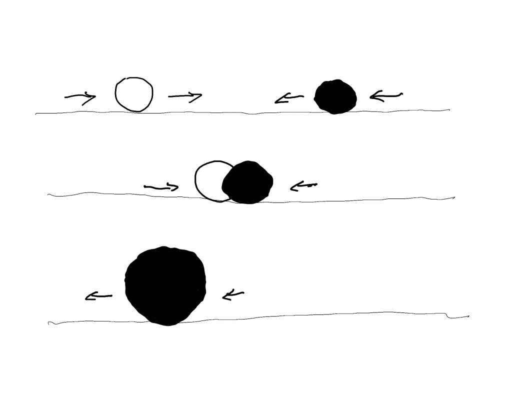 The two objects are moving towards each other, and as they overlap, the black one eats the white one and becomes bigger.