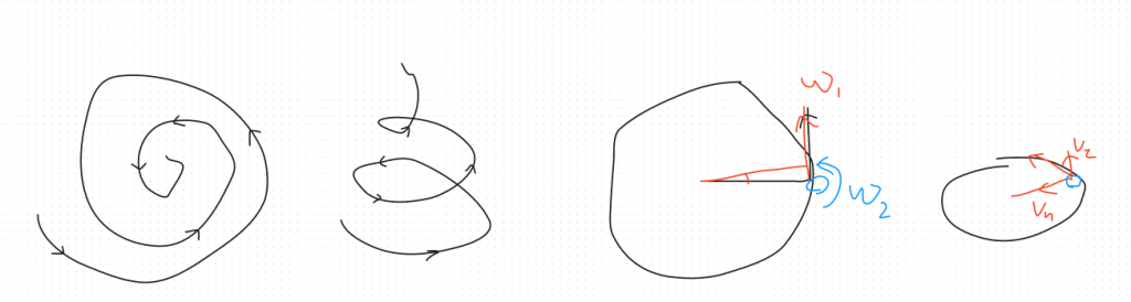 The objects are attracted to the projectile (get forward vector) at first, and adding vector in another direction (get right vector) generated the revolution.