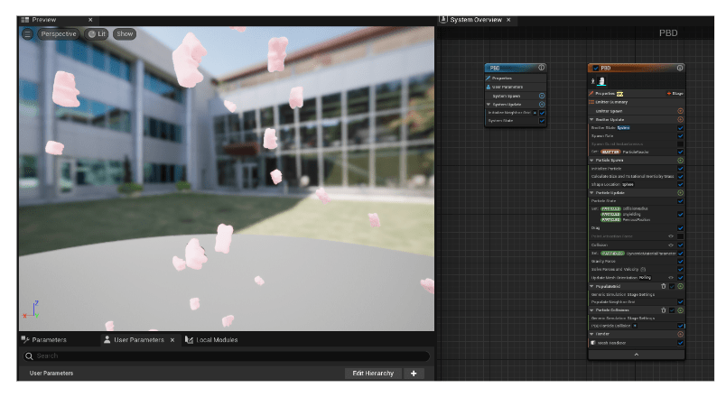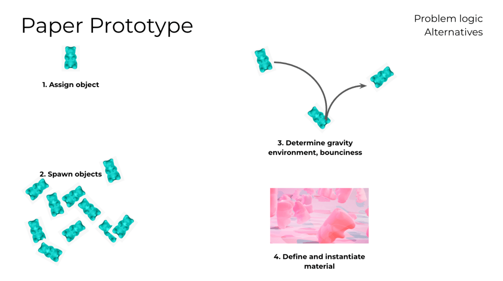 Paper Prototype: mesh, assign mesh, define parameters of spawning and gravity and collision