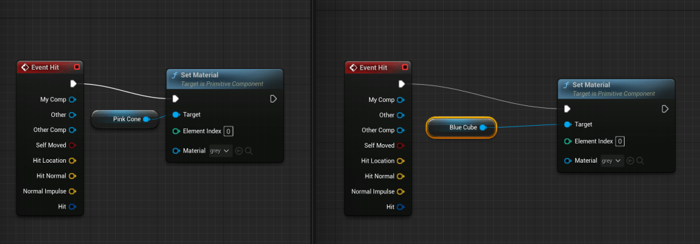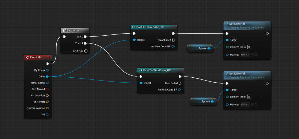 Cue Ball will turn pink or blue depending on which object it hits. By using “Sequence”, to make multiple event hits on different cast to target work.