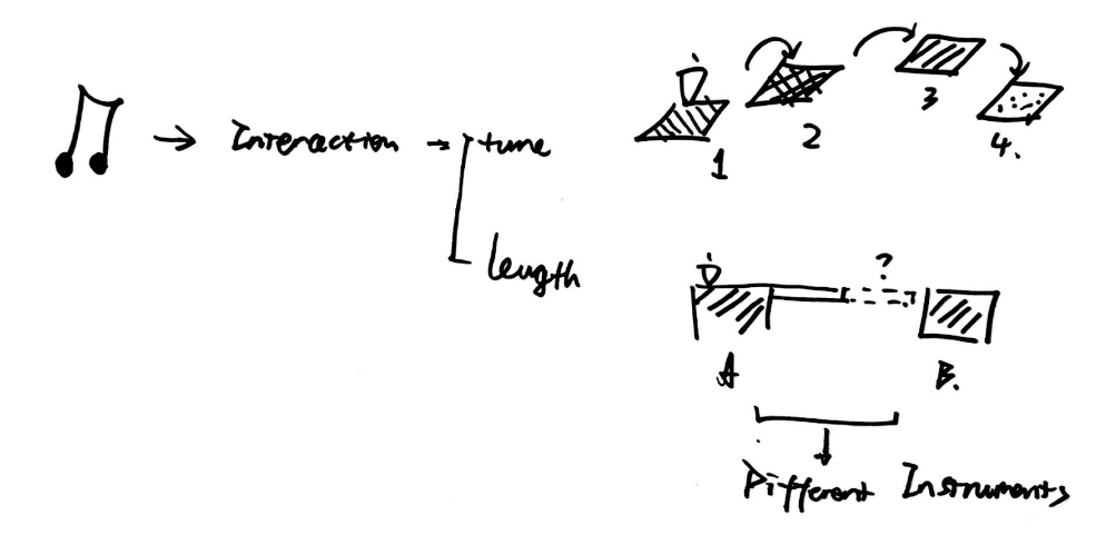 The player is on the platform representing the musical instrument. The left button is charged to produce the musical instrument melody. The board grows vertically. When the left button is released, the melody ends and the board falls down to the next platform. Charging too long or too short will cause the player to fall off the platform.