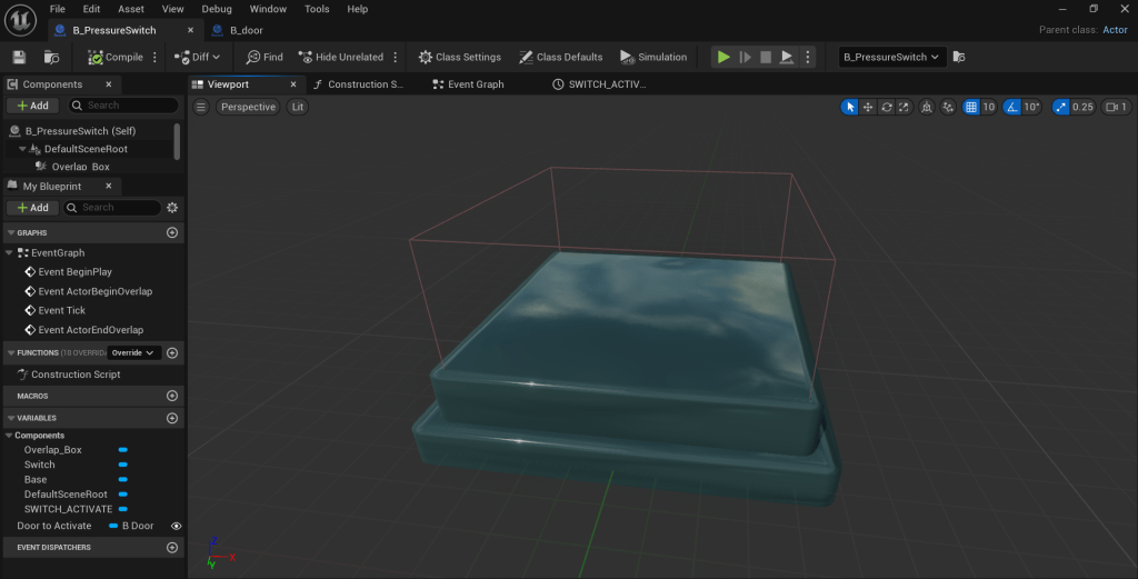 It first consisted of creating two actors: the switch on the ground and the door that would lift. And then linking the two together to affect one another.