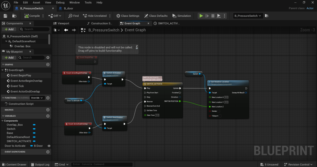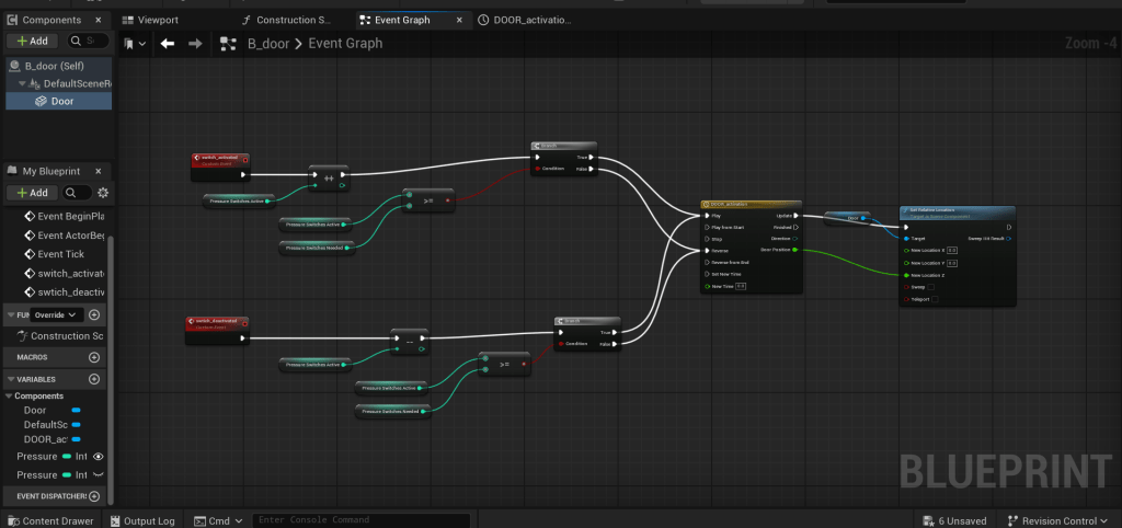 The door is given a true/false condition by creating two variables of “pressure doors needed” and pressure activated”, if the number of activations needed is equal or greater than the number of doors available, the door will change its z-axis position based on the timeline settings.