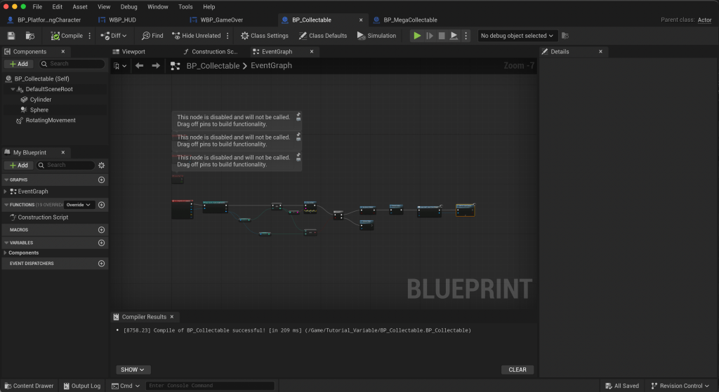 During the tutorial, I was able to get used with blueprint logic, and basic understanding of collision(responsive effect when the character hits certain object) and material.