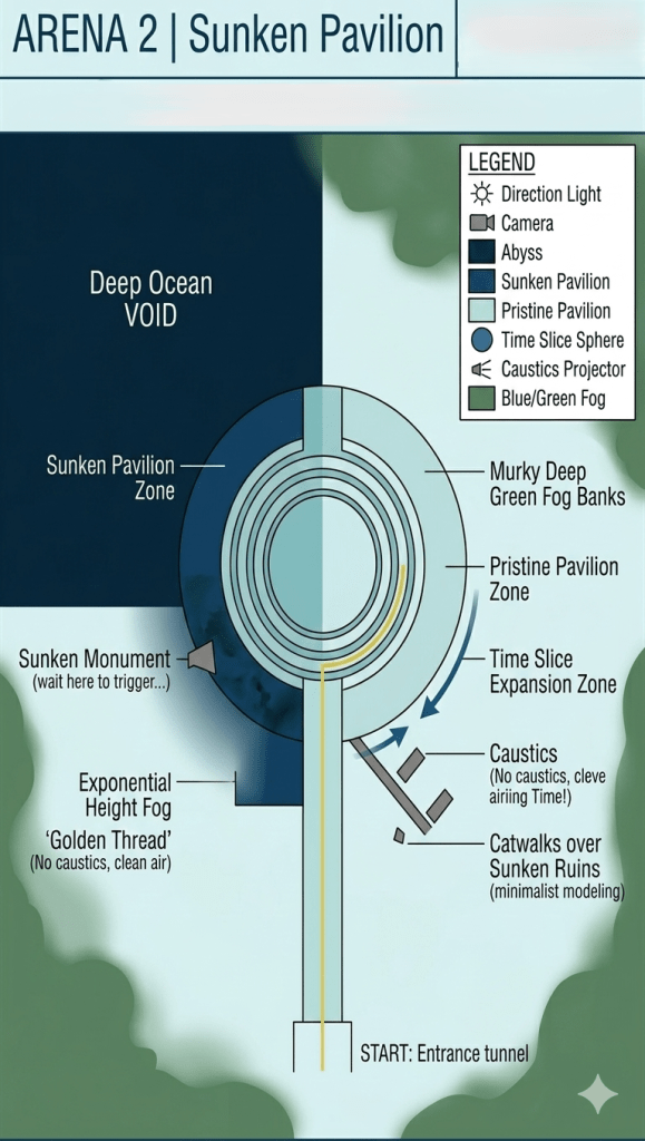- Purpose & Theme: The second arena aims to shift the focus. It moves attention from man-made destruction to climate-driven ecological collapse. The player must navigate a submerged abyss. They use the Sphere Void to carve out pockets of dry air. This process reveals the profound fragility of ancient cultural heritage in the face of natural calamity.
