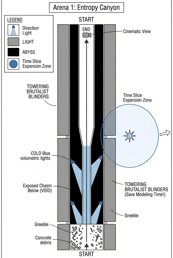 - Purpose & Theme: The purpose of this level is to explore modern, man-made architectural fragility. It is heavily inspired by the architect Lebbeus Woods and his concept of “freestanding zones” of instability. Additionally, it draws from artist Rachel Sussman’s Sidewalk Kintsugi. The narrative pushes the idea that breakage and destruction are not just mistakes to be hidden. They are highlighted events of historical memory that the player can actively interact with.