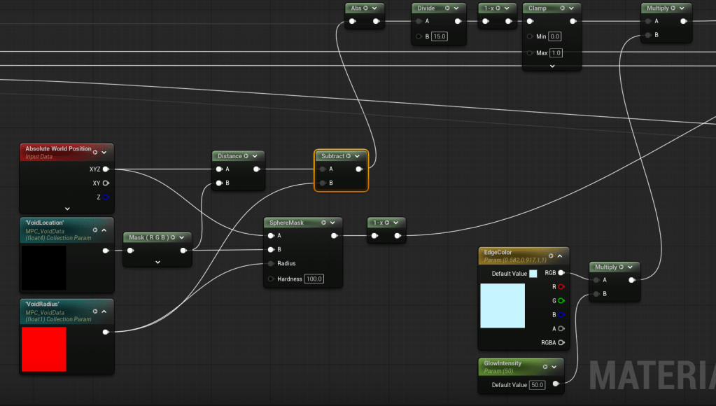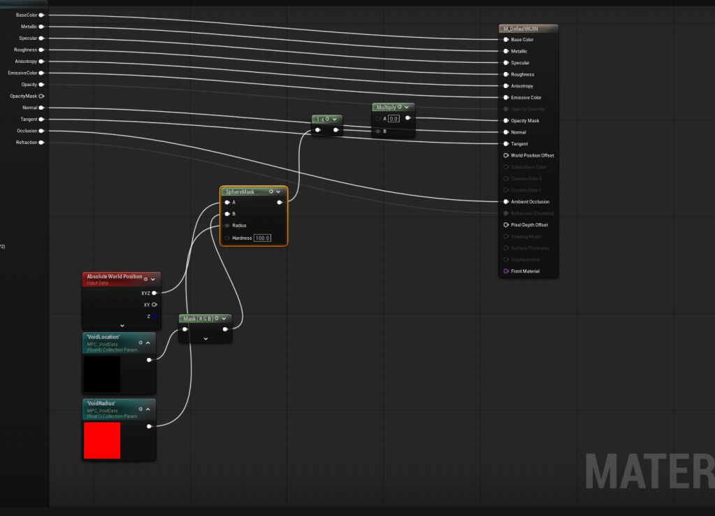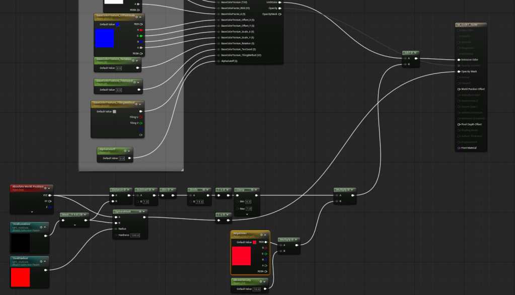 Retrofitting the Master Material: I had to carefully inject the MPC_Voiddata masking logic directly into the Opacity pipeline of these Grandparent materials. Then, I integrated it with the Base Color pipeline. This is a delicate process—altering a Grandparent material instantly cascades down to hundreds of child instances. One misaligned node could completely break the scaling. It might affect normal maps, or roughness of the entire environment. Alternatively, it could trigger thousands of shaders to recompile. Balancing this complex and hierarchical material logic was a major focus during the look-and-feel development. We also focused on heavy volumetric fog and cyan god-rays, all without tanking the game’s frame rate.